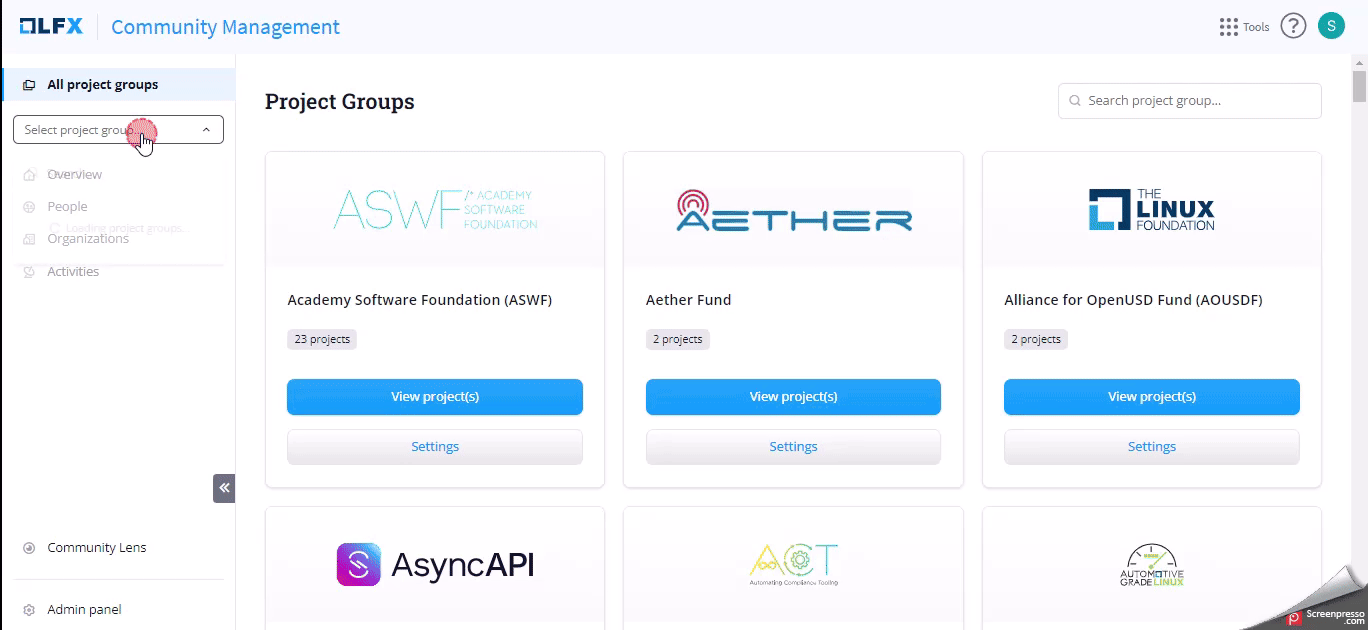 On the **Project Groups** page, you can see all the onboarded project groups and your project groups.