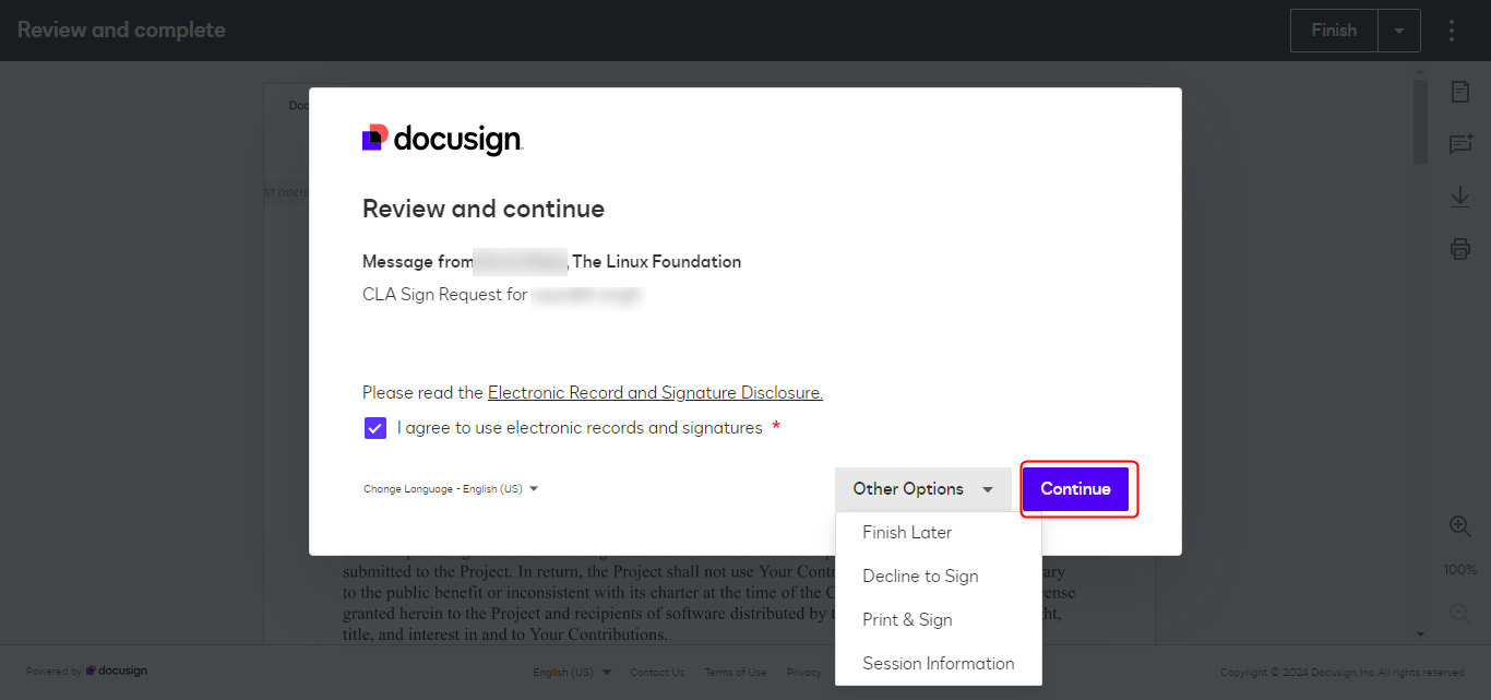 Select the check box and click CONTINUE. Follow the instructions in the DocuSign document, fill in the indicated fields, sign it, and click FINISH.