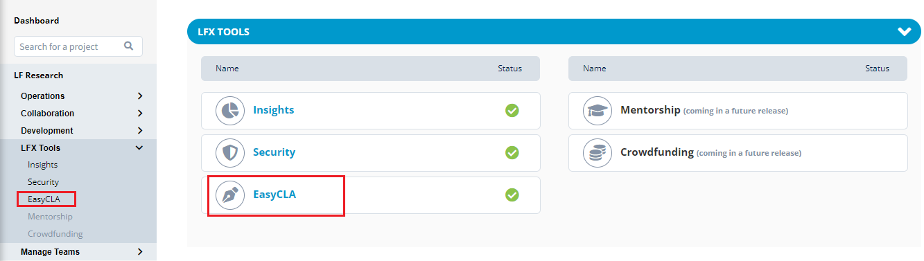 3\. From left-side navigation, Navigate to **LFX Tools >** **EasyCLA**.
