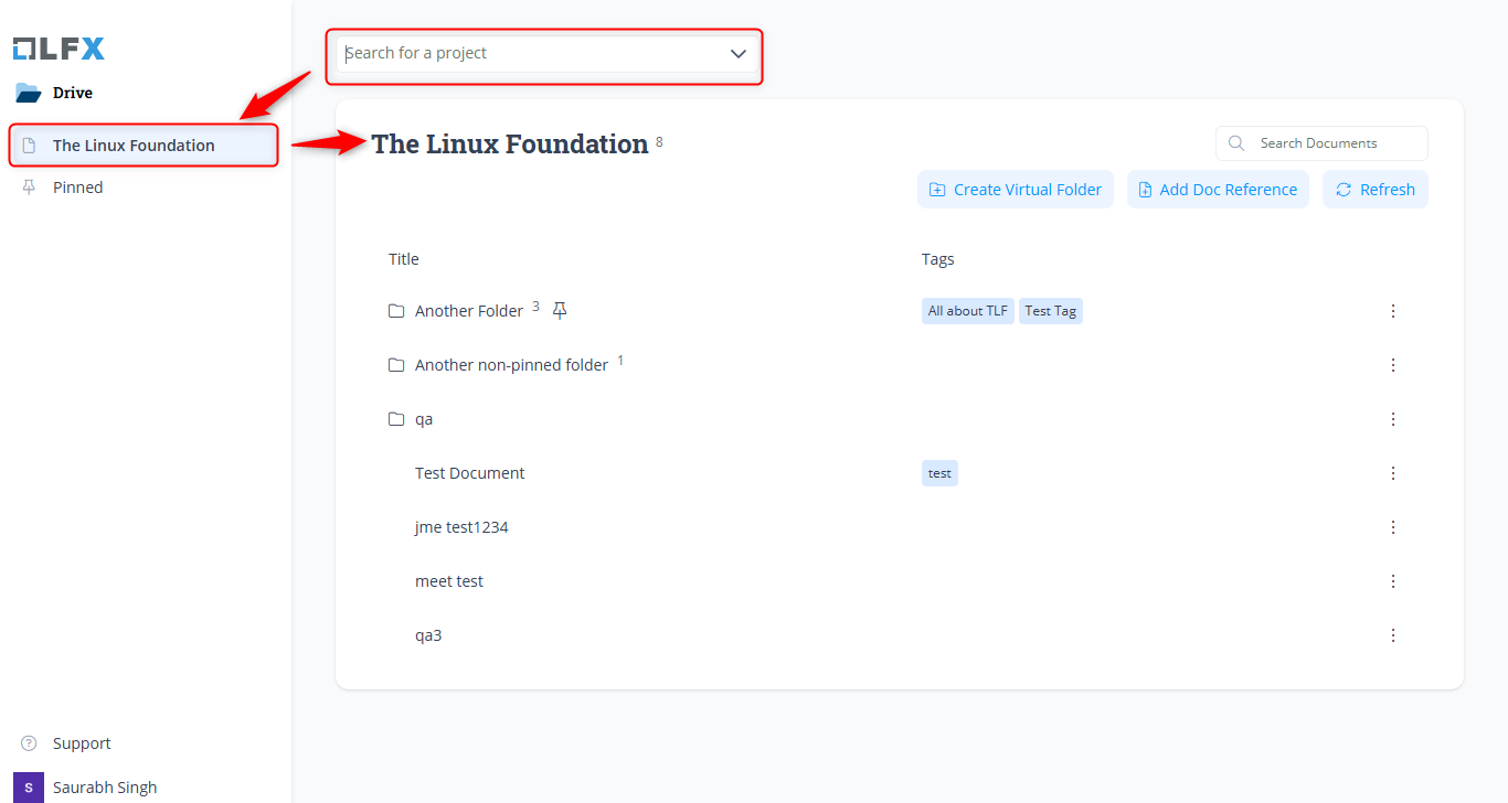 * **Project**: Shows the selected project whose documents you want to manage (e.g., *The Linux Foundation*).