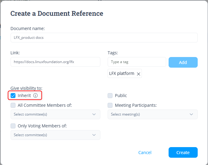 3. Under visibility, if you check `Inherit` checkbox, the reference will have the parent folder access properties, and other options will be grayed out.