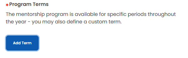 | **Program Terms**                    | <p>Terms for your mentorship program. A program can have a maximum of two terms at the same time.</p><p><img src="https://3411187760-files.gitbook.io/~/files/v0/b/gitbook-x-prod.appspot.com/o/spaces%2F-M2DCN9UgoRgMEkgnLyP-887967055%2Fuploads%2Fgit-blob-b3378301b7d6b898cc7150ed3d768252ad99b494%2Fimage.png?alt=media" alt="" data-size="original"></p><p><strong>Note:</strong> Program administrators can use any <em>Term</em> name during program creation.</p><p>For example, Spring 2021, Summer 2021, Fall 2021, and so on.</p><p>For Full Time (FT) and Part Time (PT) distinction, please add FT or PT to the name, i.e. Spring 2021- FT</p> |