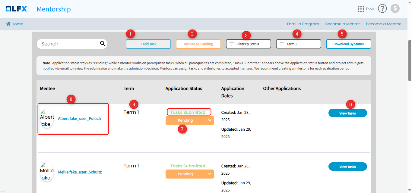 | **View Tasks**                               | CTA to [view and manage](https://docs.linuxfoundation.org/lfx/mentorship/administrators/manage-mentee-tasks) mentee tasks                                            |