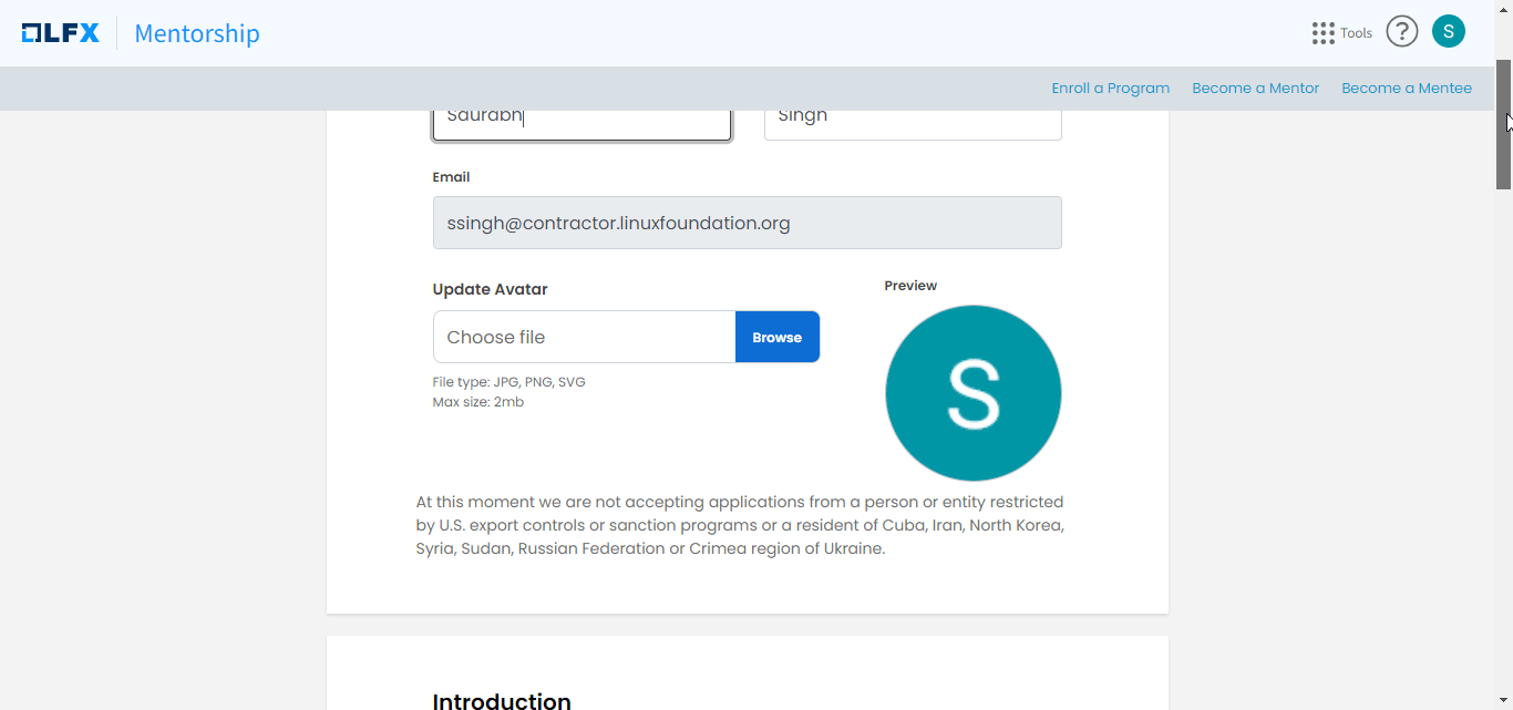 Use an avatar (image) to represent yourself. Your avatar appears on your mentor's card under Mentees. Click **Browse** to upload a JPG, PNG, or SVG file.