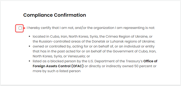 You must check the box to confirm that you are not from a restricted country before completing your profile.