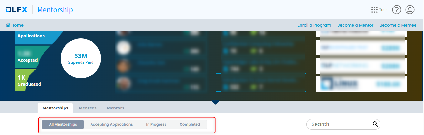 Under the **Mentorships** tab, click the mentorships that are accepting applications, completed, or in progress.