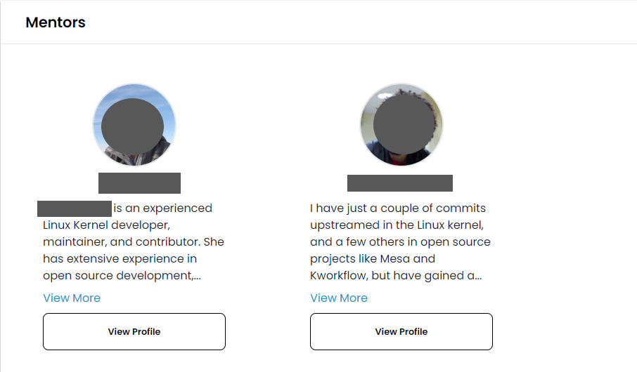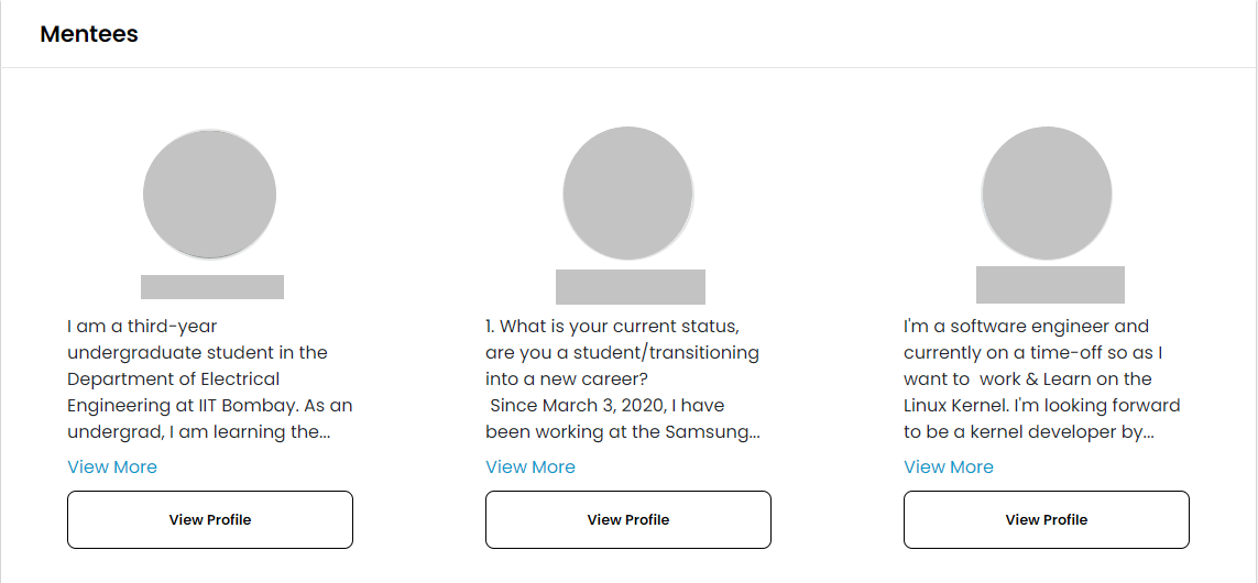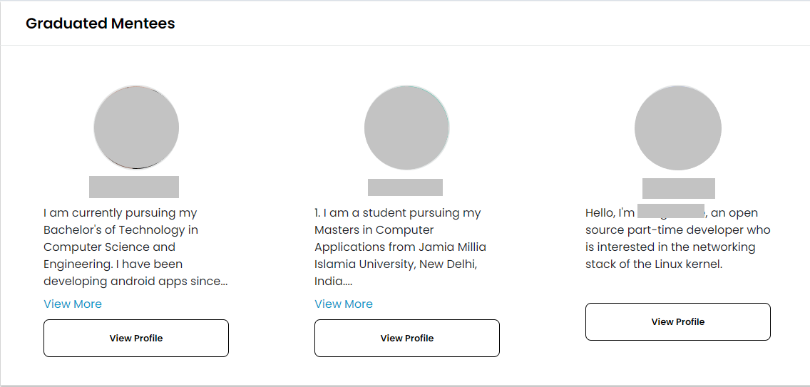 **The Graduated Mentees** section contains profiles of the mentees who completed the project's mentorship program. Click on **View Profile** and navigate to the mentor's profile page.
