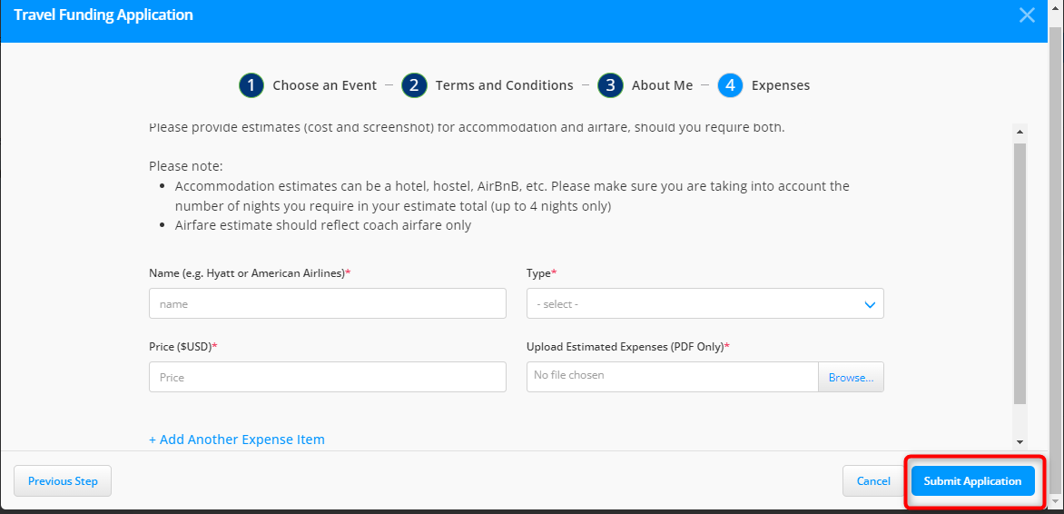 8\. On the **Expenses,** fill in your expense details and **Submit Application**.