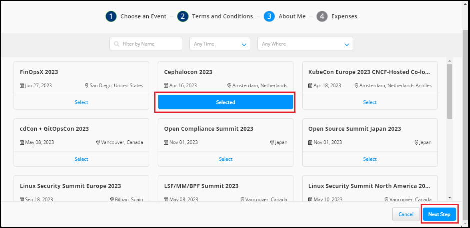 * Enter the following details that are specific to CNCF events and click **Next Step**.