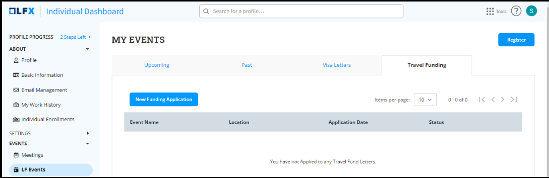 4. On the **MY EVENTS** page, click the **Travel Funding** tab. Click the **New Funding Application** CTA to access the application page.