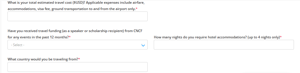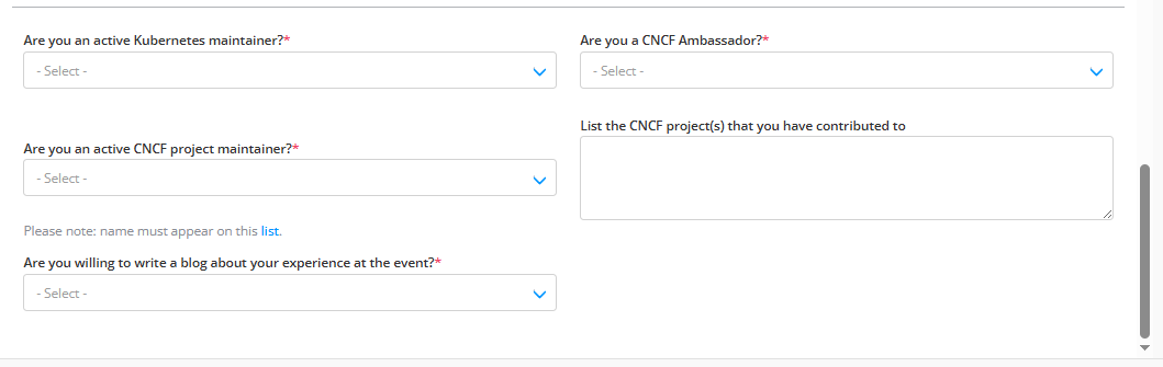 * Select the CNCF specific details from the dropdown. Select **Yes** if you received travel funding from CNCF in the past 12 months.