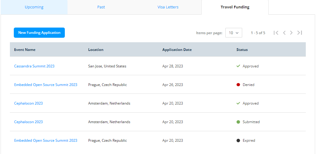Once your request is approved by the event team, you can see the status change as **Approved** on the **Travel Funding** pag&#x65;**.**
