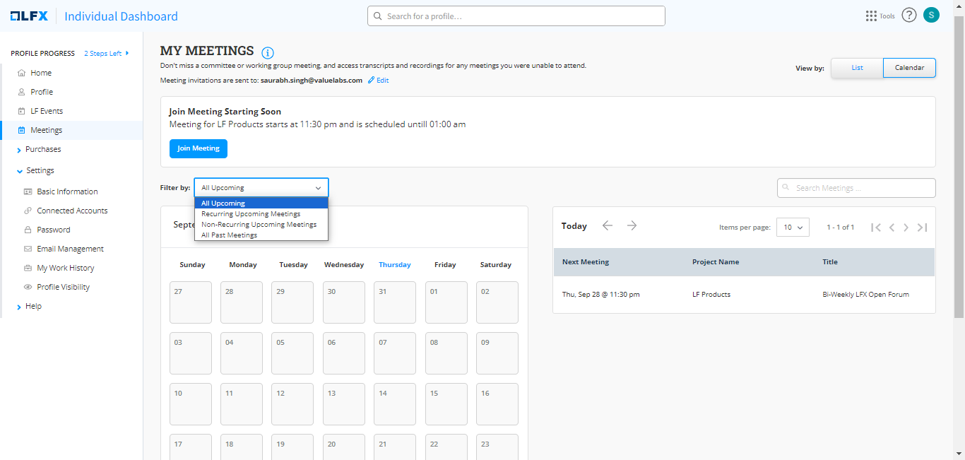 1. Log into [My Profile](https://openprofile.dev) using your LF account, and from the left side navigation pane, click **Meetings**.