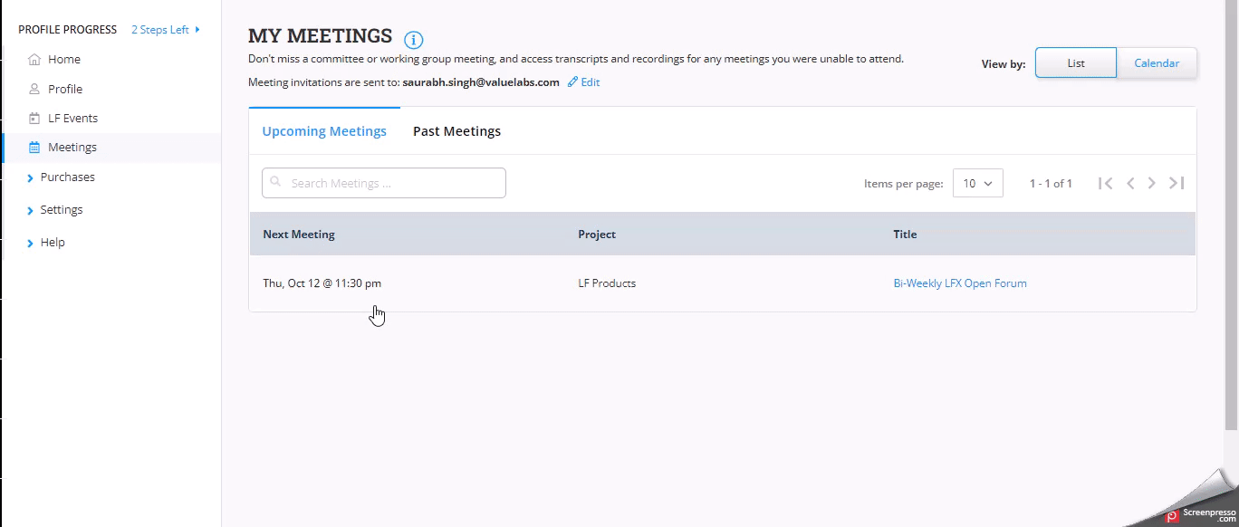 1. Log into [My Profile](https://openprofile.dev) using your LF account, and from the left-side navigation pane, click **Meetings**.