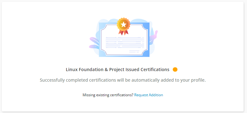 To view completed certifications, scroll down to the Linux Foundation & Project Issued Certifications section. If your certification names are not displaying, click Request Addition to submit a ticket to get it added on your profile page.