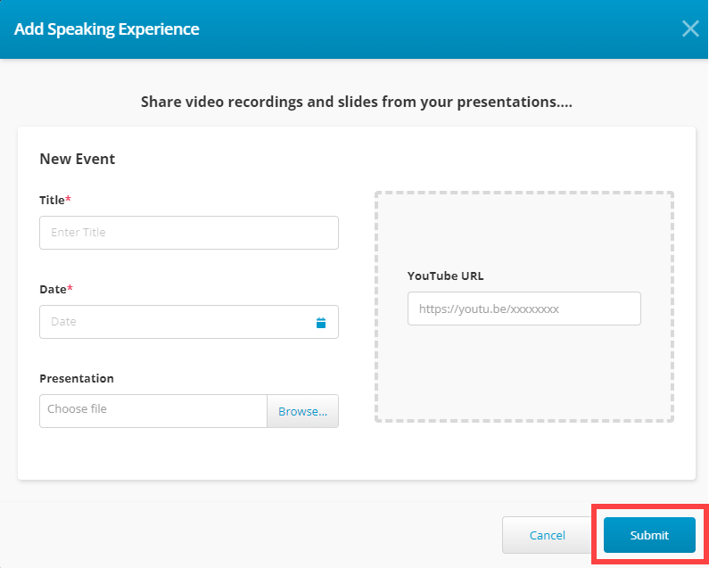 Provide event details such as title, date of the event, presentation file, and youtube URL if there is any, and click Submit.