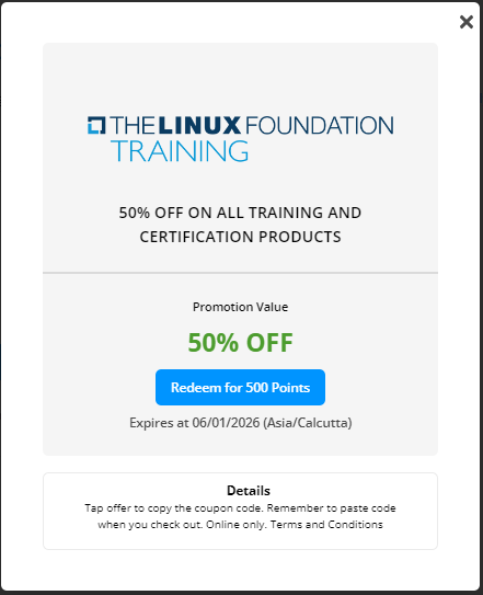 * If you have previously registered for any event or purchased any training or certifications from the Linux Foundation, For example, if you have registered for an event, say the Cloud Native conference, you will receive an earned coupon for that.