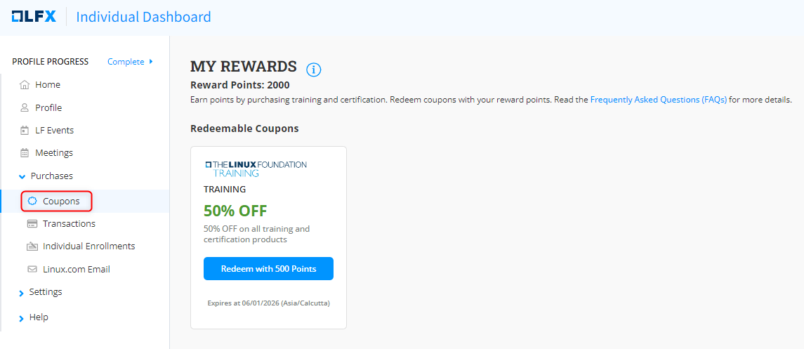 * If you have purchased any training and certification products. You earn 1 point for every $1 spent on training and certification products. You can redeem a coupon by using these reward points.