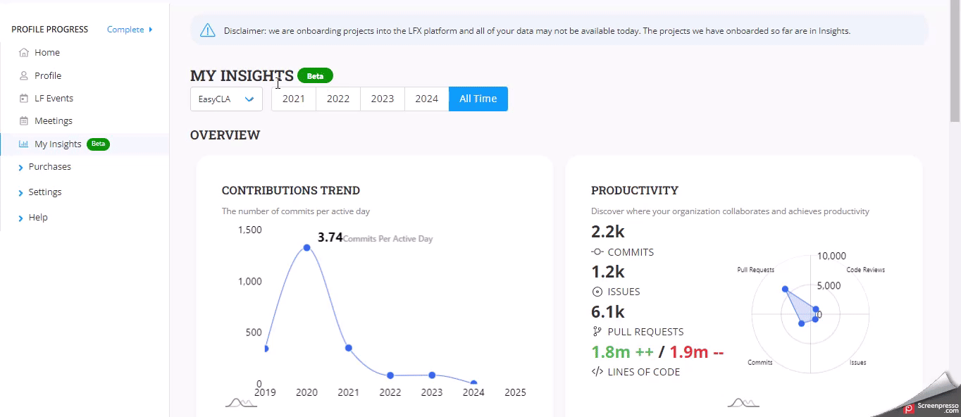 To see your open source project contributions on **My Insights,** you must connect at least one identity to the data source.
