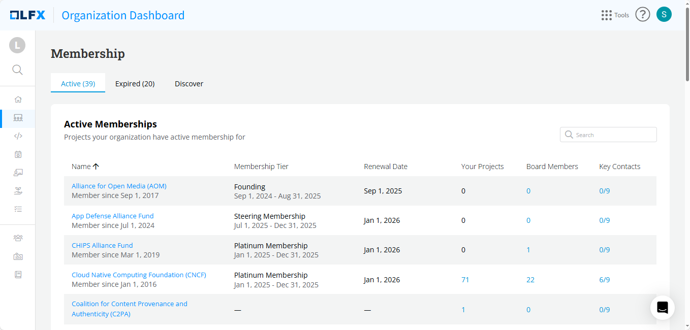 Membership offers detailed insights about the membership options available within your organization. Organizations can enroll in various memberships provided by different open-source projects.