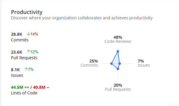 Productivity: helps you understand and analyze where and how your organization collaborates and drives productivity within open-source projects.