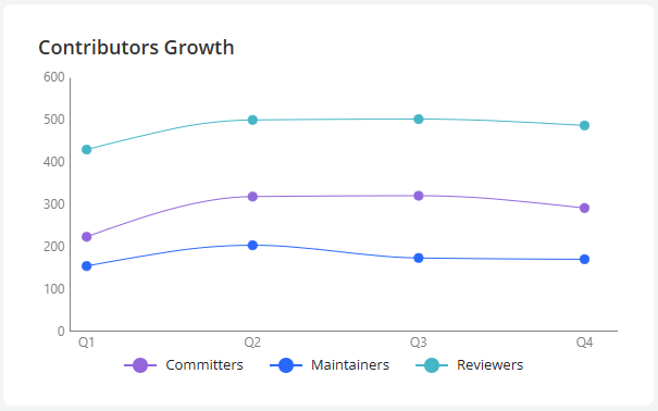 Contributors Growth Line Chart: This chart displays the growth over time of Committers, Maintainers, and Reviewers, allowing you to visualize trends and patterns in contributions.