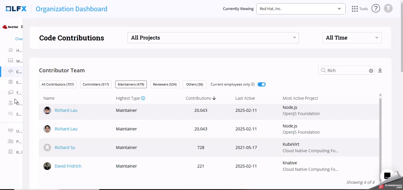 Tabs: Use the tabs at the top of the leaderboard to filter the view according to contributor roles: All Contributors, Committers, Maintainers, Reviewers and Others.