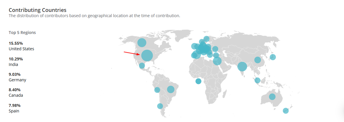 Contributing Countries: A visual representation showing the geographic distribution of contributors. Hover over the blue circle to see the contributions from that geo-location.