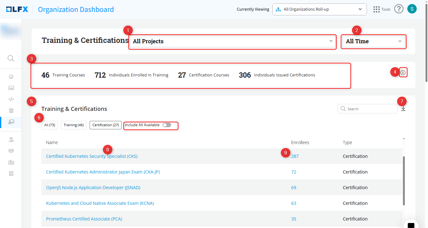 1. Click **All Projects\`** drop-down to select the open source project for which you want to see the training and certifications data.