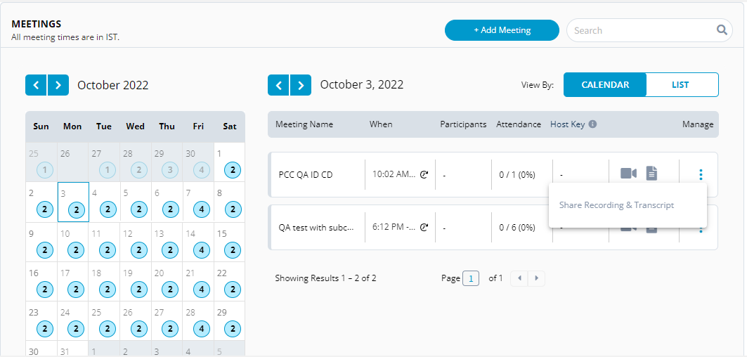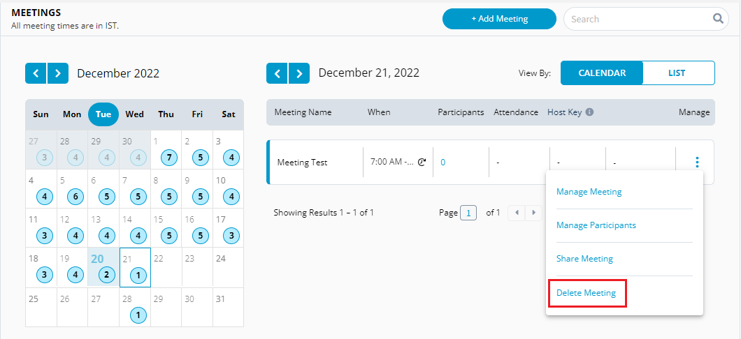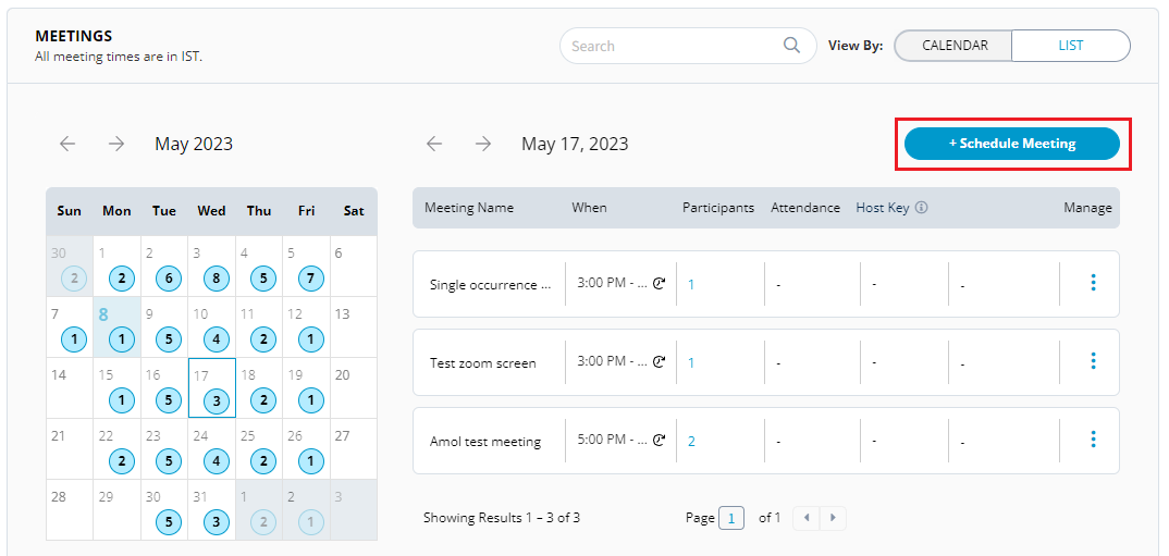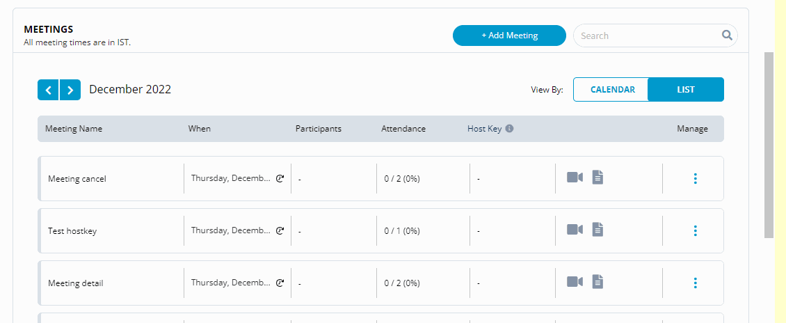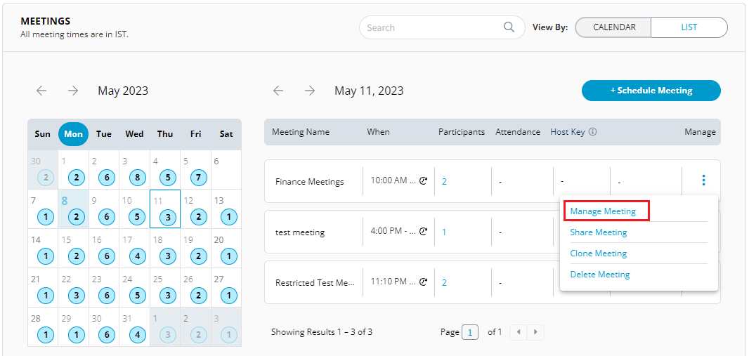 You can view the meetings either in **List View** or in **Calendar View**. List view provides list of meetings that are scheduled and the Calendar view shows the scheduled meetings in a calendar.