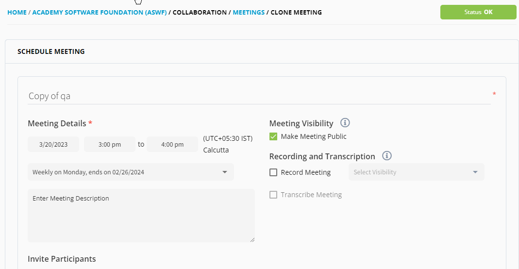 Meeting Management allows you to schedule a recurring or a non recurring meetings. You can schedule a meeting and add participants belonging to various committees. You can also invite a private induvial who does not belong to any community.