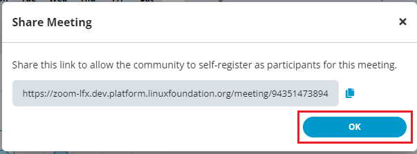 2.The Share Meeting pop message appears. Click the Copy <img src="https://3411187760-files.gitbook.io/~/files/v0/b/gitbook-x-prod.appspot.com/o/spaces%2F-M2DCN9UgoRgMEkgnLyP-887967055%2Fuploads%2Fgit-blob-e8f8efcb8ad2604ca6789a89b2ab3f3caa0fa572%2FCopy.png?alt=media" alt="" data-size="line"> icon to copy the meeting link and click **OK**.