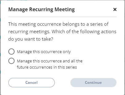 2.The Manage Recurring Meeting dialog box appears. You can either update the changes to only the current occurrence meeting or to all the occurrences and select the **Continue**.