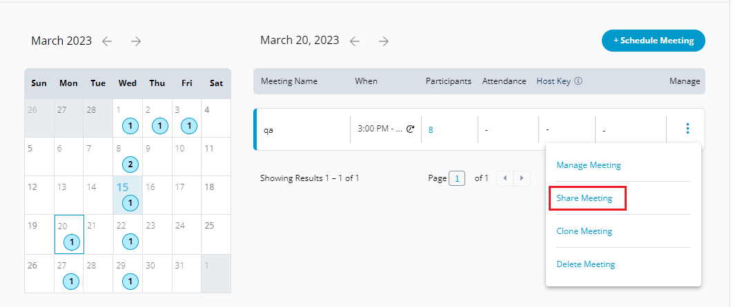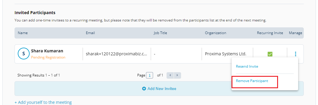 Manage Meetings also allows you to manage participants. You can resend the invite to the participants, add new participants, and remove a participant from the meeting.
