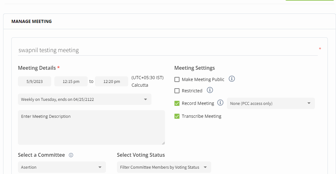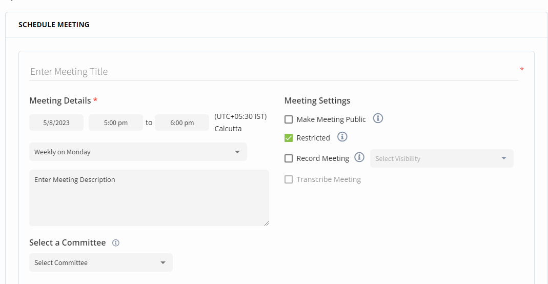 | Meeting Settings Meeting Visibility | <ul><li><strong>Make Meeting Public</strong> - By default, all meetings will be private. If you want to make the meeting public, you need to select the <strong>Make Meeting Public</strong>.</li><li><strong>Restricted</strong> - You can select this option to restrict the meetings to the invited participants only.</li><li><p><strong>Record Meeting</strong> - Select this meeting to record a meeting.</p><ul><li><strong>None</strong>- Meeting recording will be shared only with the PCC access only.</li><li><strong>Meeting Attendees</strong> - Meeting recording will be shared with the attendees who have attended the meeting.</li></ul></li><li><strong>Transcribe Meeting</strong> - Select the transcript visibility. You can either set the visibility of the transcription as Private or Public.</li></ul> |
