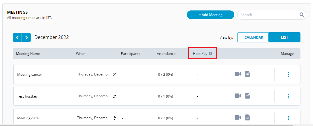 When the meeting is within one hour of the scheduled time, the Host Key appears as a masked key. You can click the <img src="https://3411187760-files.gitbook.io/~/files/v0/b/gitbook-x-prod.appspot.com/o/spaces%2F-M2DCN9UgoRgMEkgnLyP-887967055%2Fuploads%2Fgit-blob-ca120f448fc70c7e702bf47bb140d7bd9a3ab5bc%2FEye.png?alt=media" alt="" data-size="line"> icon to see the host copy and click the <img src="https://3411187760-files.gitbook.io/~/files/v0/b/gitbook-x-prod.appspot.com/o/spaces%2F-M2DCN9UgoRgMEkgnLyP-887967055%2Fuploads%2Fgit-blob-54c623ad7c1ee551f177224cb535d9d7ba06a238%2FCopy.png?alt=media" alt="" data-size="line"> icon to copy the host key.
