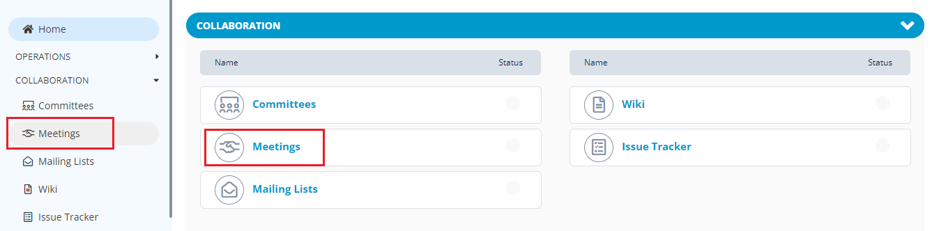 You can also navigate to Meeting Management from the Vertical Sidebar navigation menu. Click **Collaboration** and then select **Meetings**.
