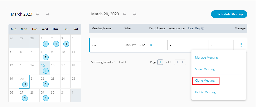 1.Select the scheduled public meeting that you want to clone, click <img src="https://3411187760-files.gitbook.io/~/files/v0/b/gitbook-x-prod.appspot.com/o/spaces%2F-M2DCN9UgoRgMEkgnLyP-887967055%2Fuploads%2Fgit-blob-97df70cbeddb789de4b00f8499b9369b724ca568%2Felicp.png?alt=media" alt="" data-size="line"> icon and select **Clone Meeting**.