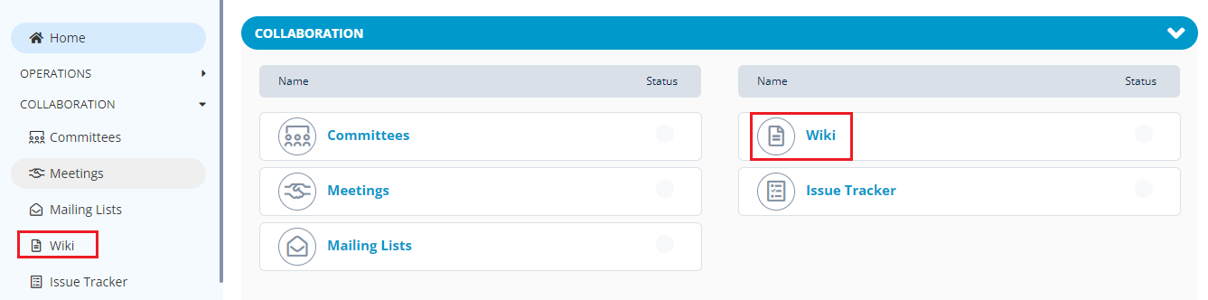 You can also navigate to Wiki from the Vertical Sidebar navigation menu. Click **Collaboration** and then select **Wiki**.