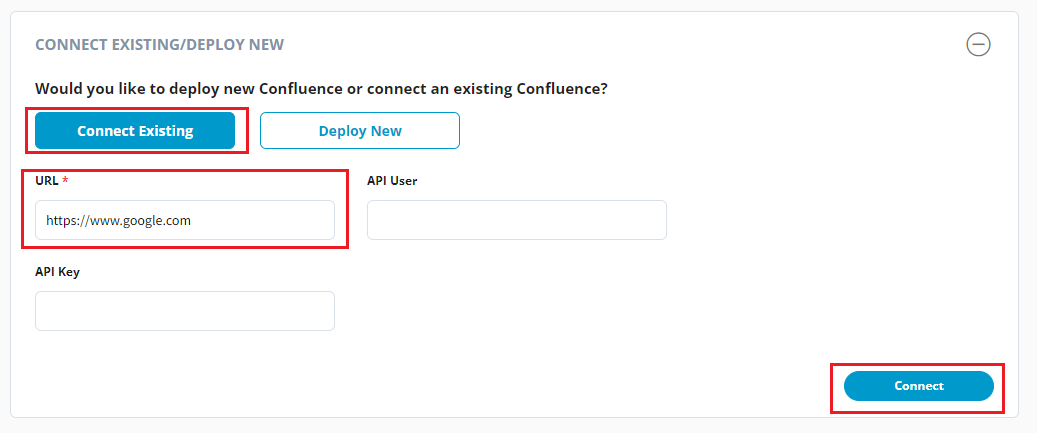 a) If you want to connect to the existing server, Click **Connect Existing**. Enter **URL** of the existing server and click **Connect**. The Confluence page will be setup to the existing server.