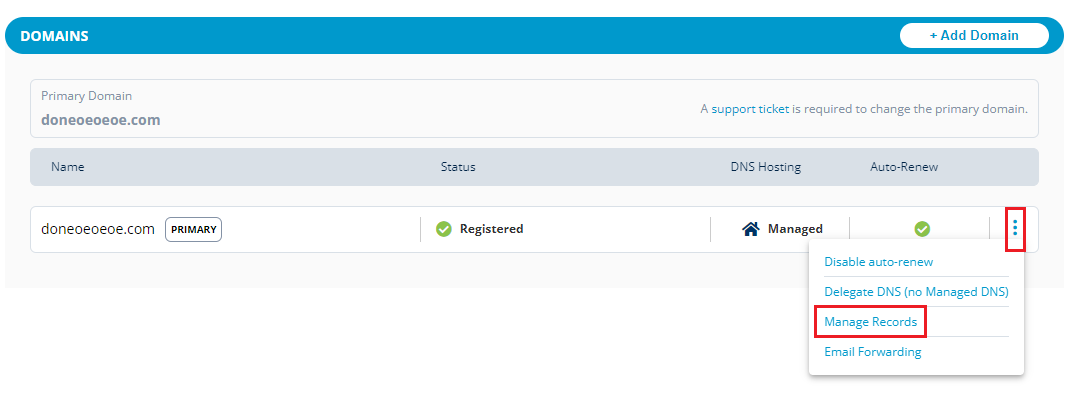 2.Click <img src="https://3411187760-files.gitbook.io/~/files/v0/b/gitbook-x-prod.appspot.com/o/spaces%2F-M2DCN9UgoRgMEkgnLyP-887967055%2Fuploads%2Fgit-blob-33d913907643827bda6fde256696cfd7506a5a16%2FDomdot.png?alt=media" alt="" data-size="line"> icon and select **Manage Records**.