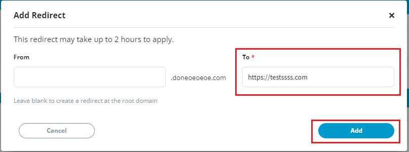 4.The Add Redirect dialog box appears. Enter the redirect domain under **To** box and click **Add**.