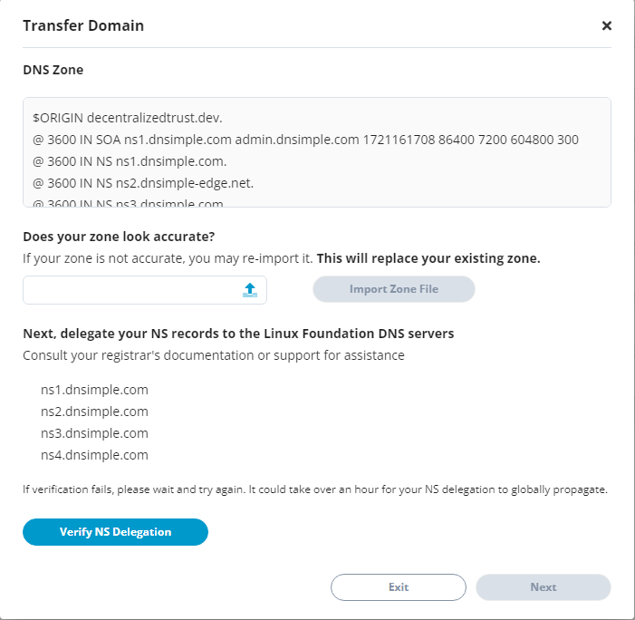 On the Next page, you will be asked if you want to delegate the DNS to the Linux Foundation or keep DNS management at its current location. In most cases, you will want The Linux Foundation to manage DNS.