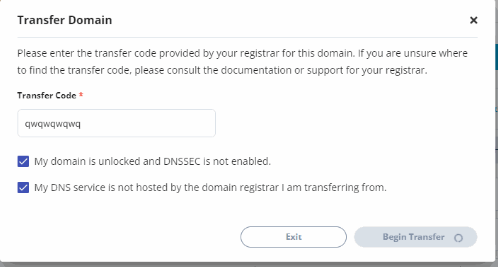 icon, select Continue Transfer and enter the transfer code that you will receive from the registrar of your domain. Select My Domain is unlocked and My DNS Service is not hosted and click Begin Transfer.