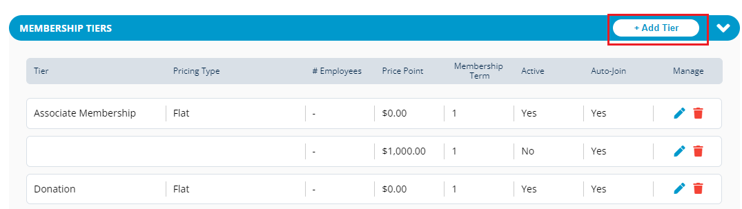 Without updating the **Membership Settings**, the **+ Add Tier** will not be enabled.