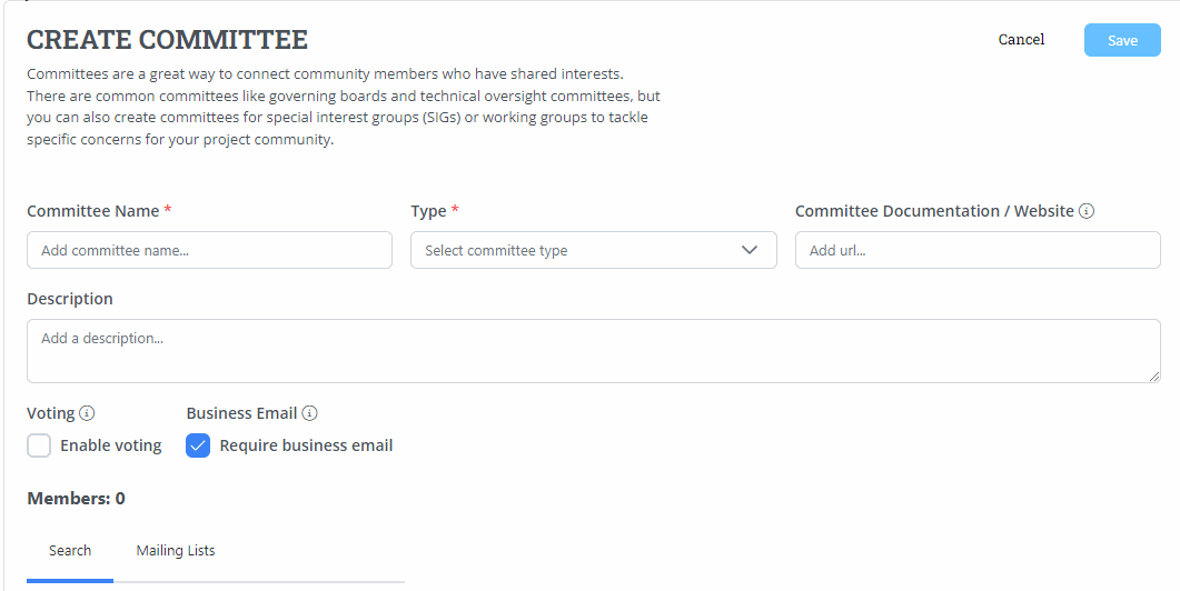 CCommittees are a great way to connect community members who have shared interests. There are common committees like governing boards and technical oversight committees, but you can also create committees for special interest groups (SIGs) or working groups to tackle specific concerns for your project community. You can add and update committee information related to the project, such as name, mailing list, committee website, permissions, and description.