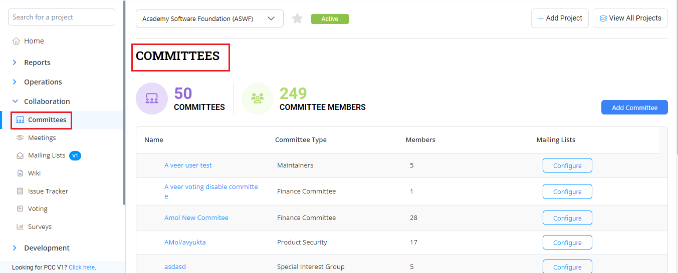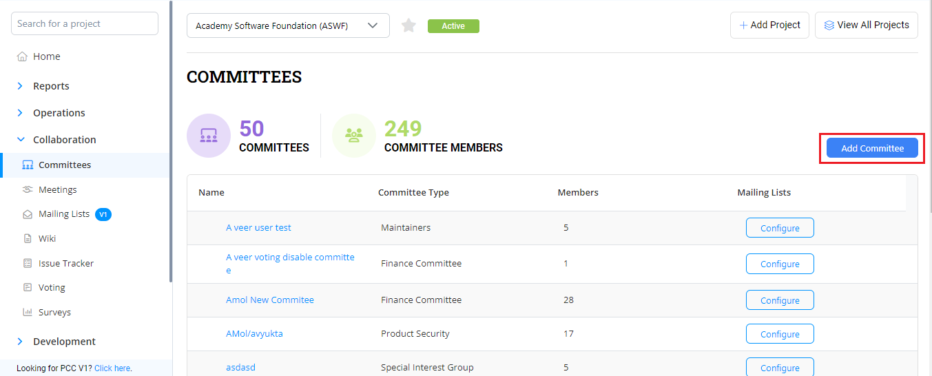 1. Select the project from the drop-down and click the **Collaboration** > **Committees** tab.