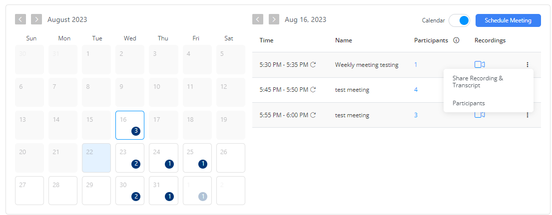 To view past meetings, select the desired date or month. The list includes details such as meeting title, date, number of attendees, recording, and transcript.