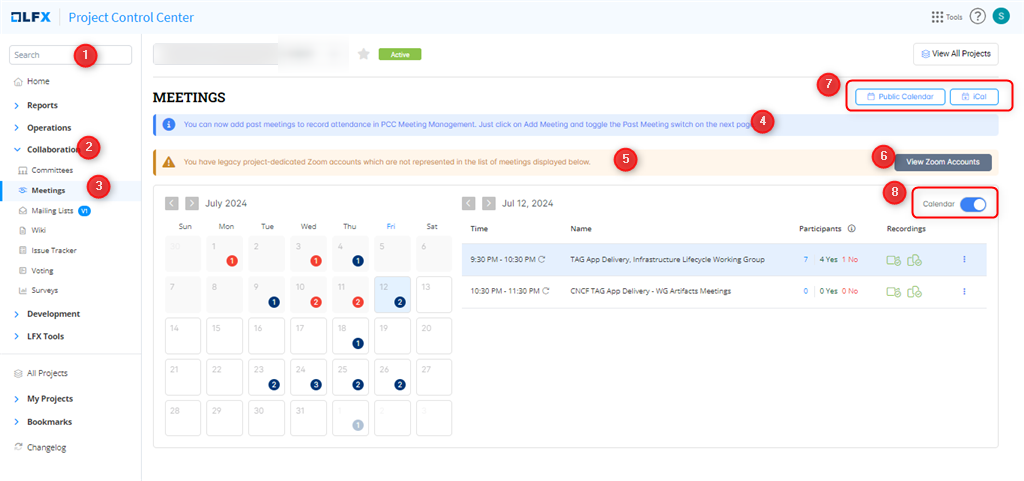 * Use the **View Zoom Accounts** button to manage legacy project-dedicated Zoom accounts not listed in the meeting display.