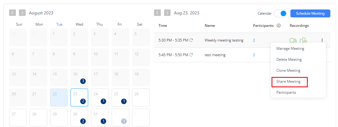 1. Select the scheduled public meeting that you want to share, click <img src="https://3411187760-files.gitbook.io/~/files/v0/b/gitbook-x-prod.appspot.com/o/spaces%2F-M2DCN9UgoRgMEkgnLyP-887967055%2Fuploads%2Fgit-blob-97df70cbeddb789de4b00f8499b9369b724ca568%2Felicp.png?alt=media" alt="" data-size="line"> icon, and select **Share Meeting**.